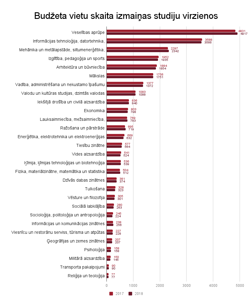No studiju virzieniem lielākais budžeta vietu skaita pieaugums pēc skaita bijis veselības aprūpes (+86 vietas, 1,8%), bet procentuāli ─ informācijas un komunikācijas zinātņu (+18 vietas, 7,6%) studiju virzienā. Lielākais samazinājums pēc studiju vietu skaita bijis enerģētikas, elektrotehnikas un elektroenerģijas (-37) un arhitektūras un būvniecības (-30), bet procentuāli ─ socioloģijas, politoloģijas un antropoloģijas (-21 vieta, -8,6%) studiju virzienā.