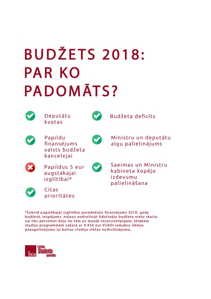 LSA uzskata, ka šībrīža situācija, kad valdība nevar valsts budžetā ieplānot papildus 4,95 eiro, kuru nepieciešamība radusies saistībā ar VSAOI iemaksu likmju paaugstinājumu, uz katras studiju vietas nodrošinājumu (bāzes izmaksu), ir absurda, nemaz nerunājot par to, ka šobrīd esošais finansējums uz vienu studējošo ir viens no zemākajiem Eiropas Savienībā un gandrīz trīs reizes zemāks par Ekonomiskās sadarbības un attīstības organizācijas (OECD) valstu vidējo. Tāpat šobrīd redzams, ka tā sauktajām “deputātu kvotām” un citām “prioritātēm”, finansējums tiks paredzēts. Šo iemeslu dēļ LSA aicina valdību un Saeimas deputātus iepriekšminētajai problēmai rast risinājumu un 2018. gada valsts budžetā ieplānot papildu nepieciešamo finansējumu augstākajai izglītībai, domājot stratēģiski un tālredzīgi par mūsu valsts nākotni, ne tikai par saviem vēlētājiem un partiju reitingiem tuvojošos vēlēšanu kontekstā!