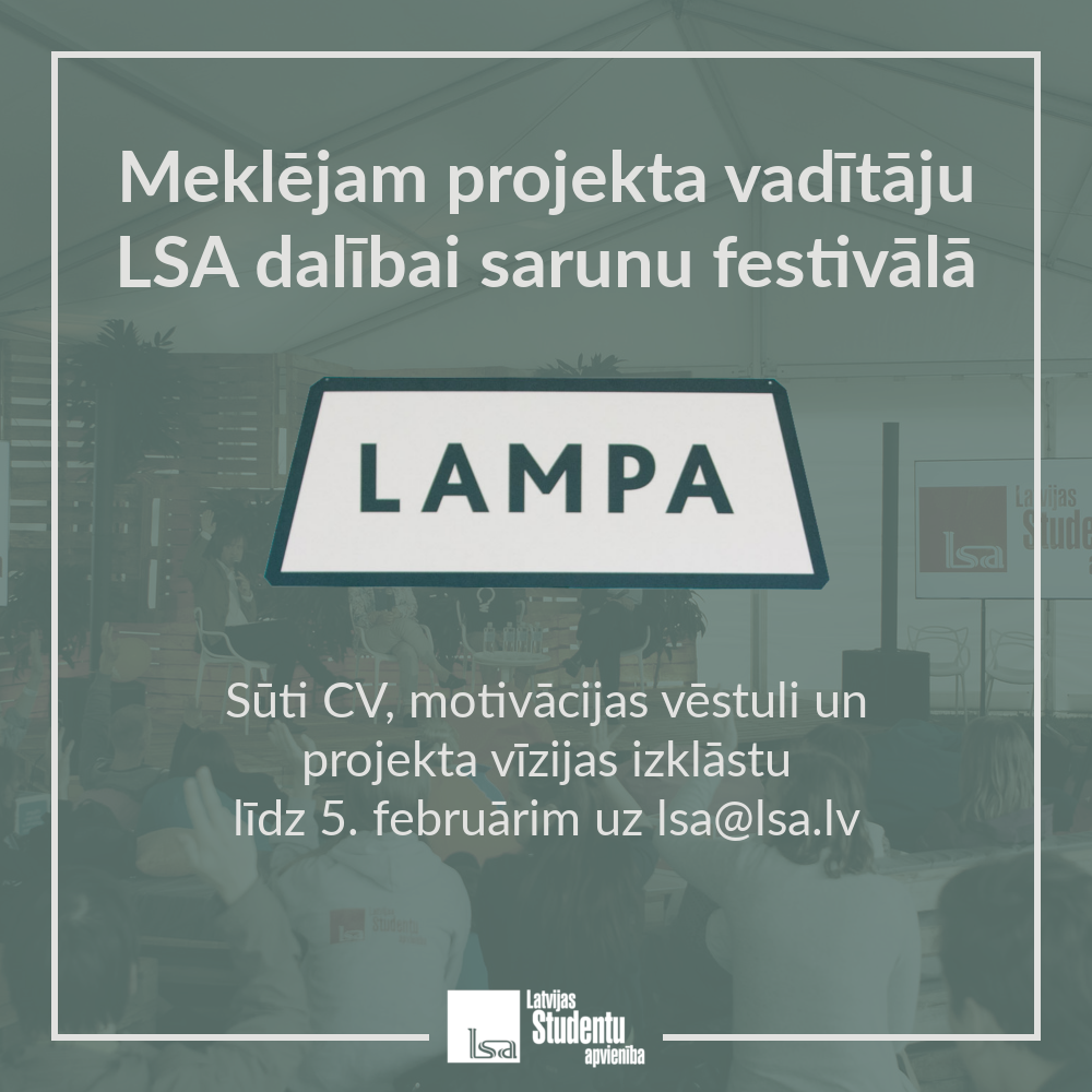 Sarunu festivāls LAMPA ir platforma visiem, kam ir ko teikt, dodot iespēju sarunāties par Latvijai, Eiropai un pasaulei būtiskiem jautājumiem. LSA ar 1,5 stundas ilgu pasākumu festivālā piedalījās jau pērn, un arī šogad vēlamies pieņemt šo izaicinājumu, tādēļ meklējam projekta vadītāju!
