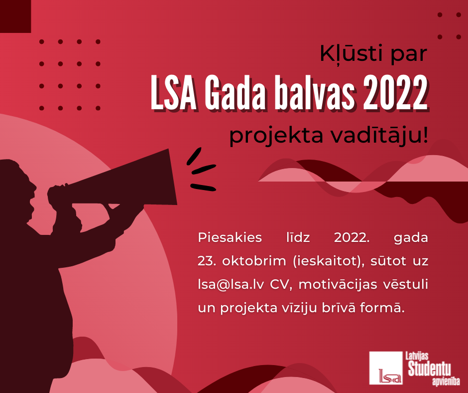 Latvijas Studentu apvienība meklē projekta vadītāju ikgadējam projektam – “LSA Gada balva 2022”. Kandidātu pieteikumi uz projekta vadītāja vietu ir jāiesūta līdz 2022. gada 23. oktobrim (ieskaitot).
