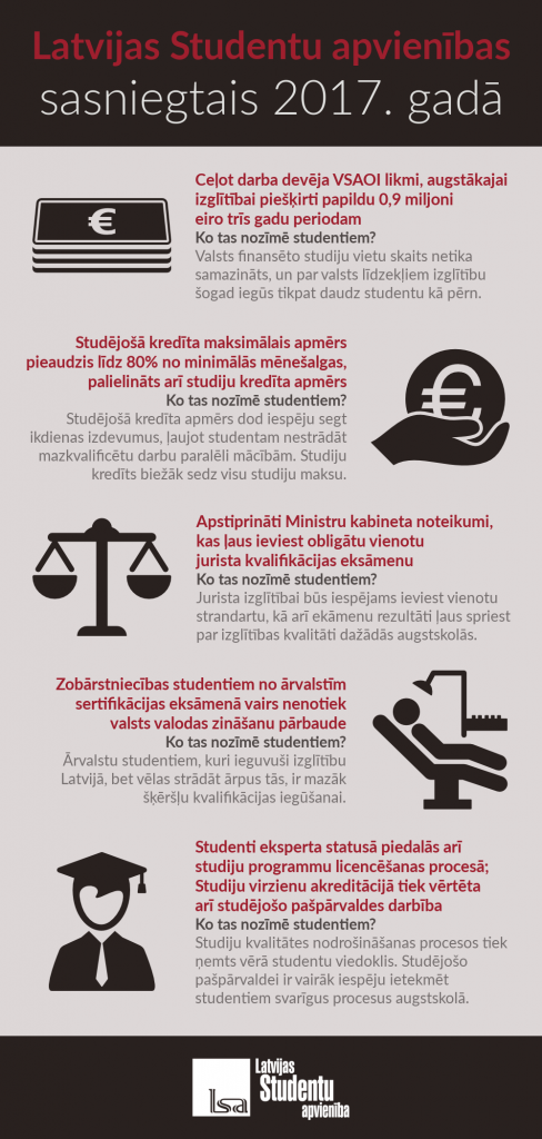 2017. gadā tikuši risināti vairāki augstākajā izglītībā būtiski jautājumi. Arī Latvijas Studentu apvienība (LSA) iesaistījās izglītības politikas veidošanā, un ir gandarīta, ka daudzos jautājumos ir panākti studējošajiem pozitīvi lēmumi. Nozīmīgākākie sasniegumi ietver: