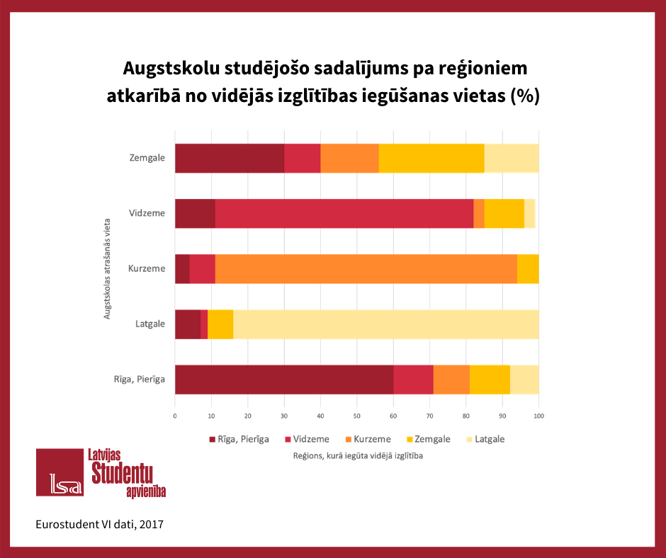 Iepriekš novērotā nevienlīdzības plaisa turpina paplašināties augstākās izglītības līmenī. Pēc EUROSTUDENT (2017) datiem redzams, ka reģionu augstskolās izvēlas studēt studējošie, kurā tie ir ieguvuši vidējo izglītību (71-84%), bet šajā pašā gadā reģionos studējošo kopskaits sastādīja 28% no visiem studējošajiem. Lielākā daļa studējošo (72%) studē Rīgas augstākās izglītības iestādēs, no kuriem vairāk nekā puse (60%) vidējo izglītību ieguvuši Rīgā un Pierīgā.