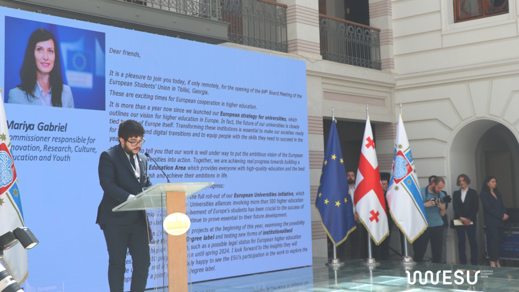 No 1. līdz 8. maijam Tbilisi, Gruzijā, norisinājās Eiropas Studentu apvienības (European Students Union, ESU) 84. biedru sapulce (BM84), kuras ietvaros tika ievēlēta 2023./2024. gada valde. Latviju BM84 pārstāvēja Latvijas Studentu apvienības (LSA) prezidente Liene Levada un Starptautiskā virziena vadītāja Agate Mačtama.