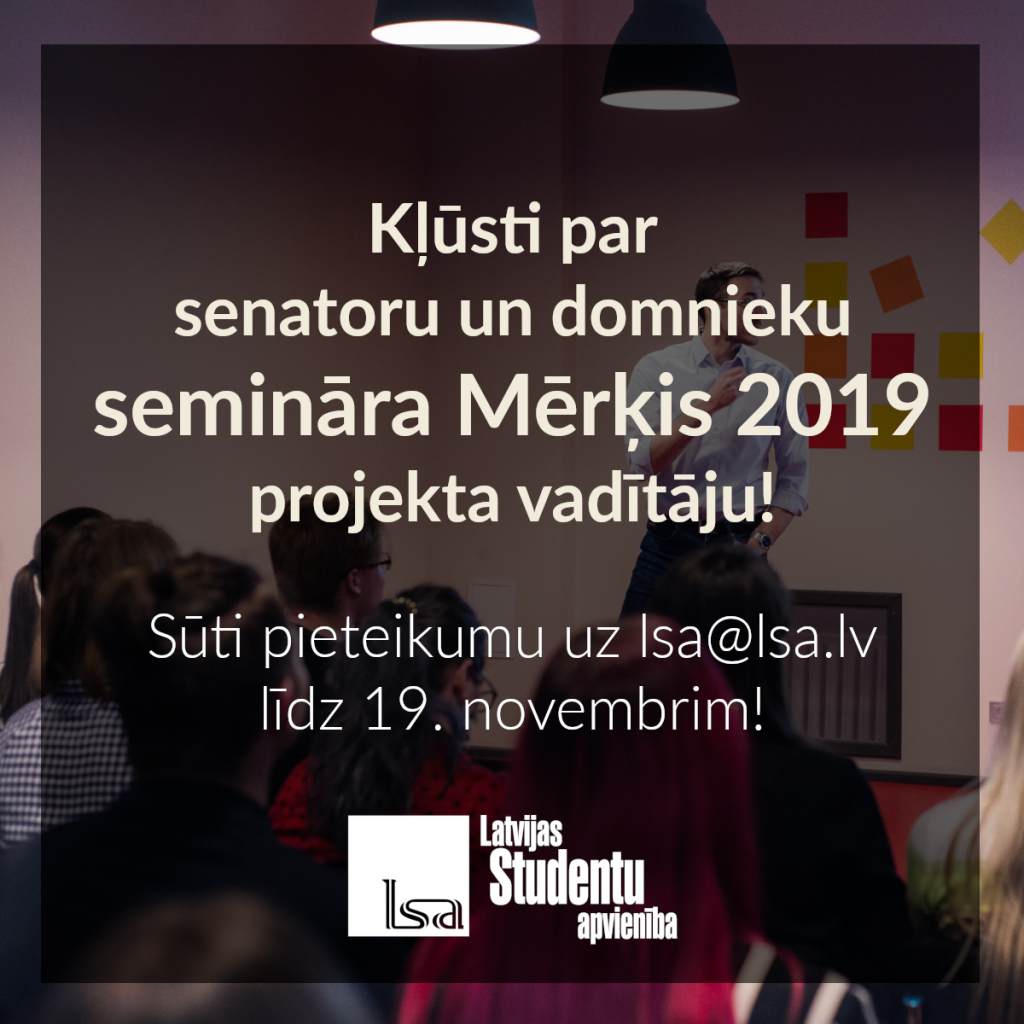 Norisinās pieteikšanās senatoru un domnieku semināra “Mērķis 2019” projekta vadītāja vietai. Pieteikties iespējams līdz 19. novembrim.