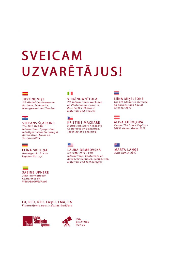 Visi finansējumu ieguvušie konferencēs piedalīsies ar savām prezentācijām. Vairāk par katru konferenci un studējošo zinātnisko darbību būs iespējams uzzināt drīzumā!