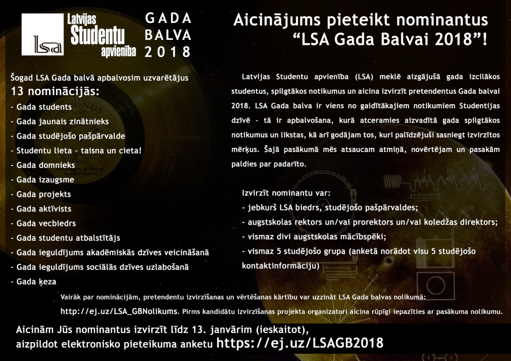 Nominantu pieteikšana pagarināta līdz 16. janvārim. To iespējams izdarīt, aizpildot pieteikuma anketu: ej.uz/LSAGB2018