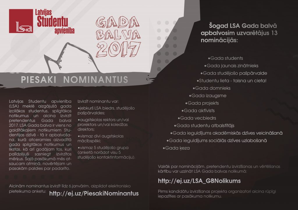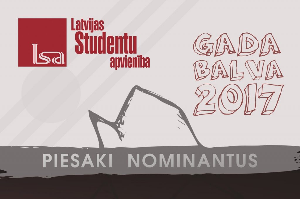 Latvijas Studentu apvienība (LSA), meklējot aizgājušā gada izcilākos studentus un spilgtākos notikumus, aicina izvirzīt pretendentus Gada balvai 2017. LSA Gada balva ir viens no gaidītākajiem notikumiem studentijas dzīvē – tā ir apbalvošana, kurā atceramies aizvadītā gada spilgtākos notikumus un likstas, kā arī godājam tos, kuri palīdzējuši sasniegt izvirzītos mērķus. Šis pasākums būs brīdis, kurā atsaucam atmiņā, novērtējam un pasakām paldies par padarīto.