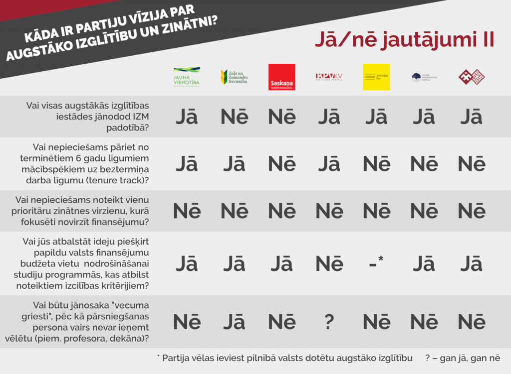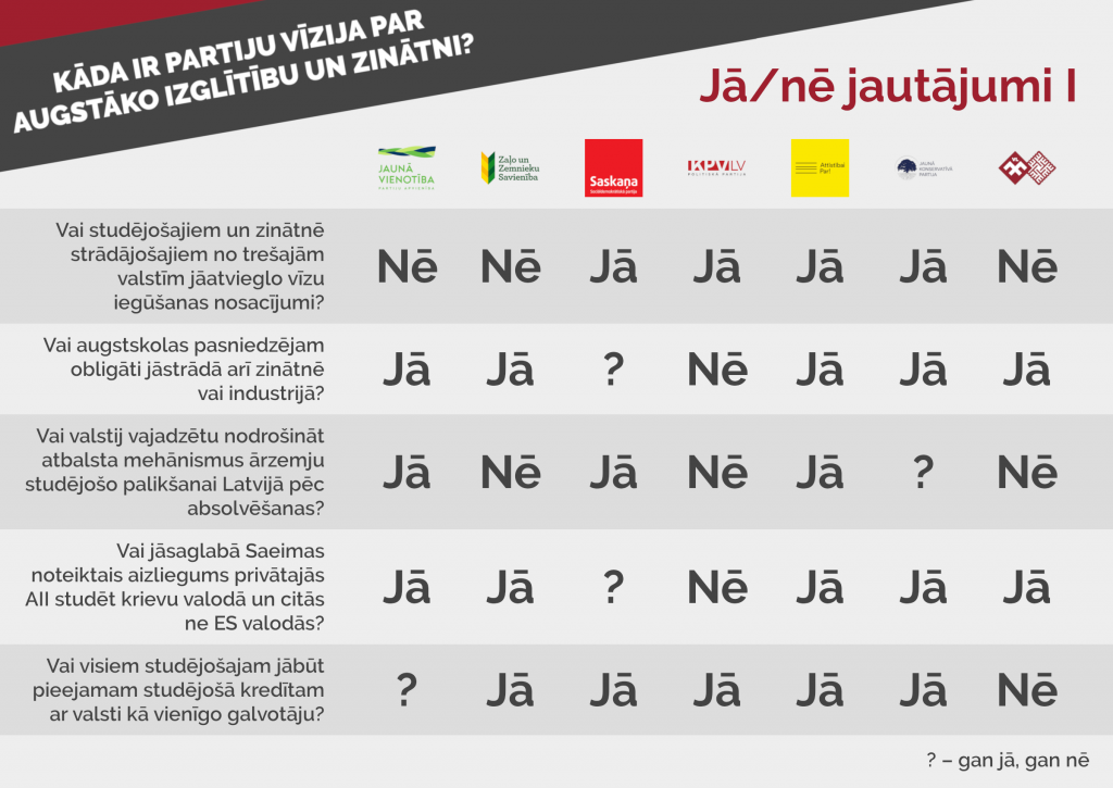 Debašu organizatori bija sagatavojuši jautājumu katrai partijai saistībā ar tās programmā minēto par augstāko izglītību un zinātni.