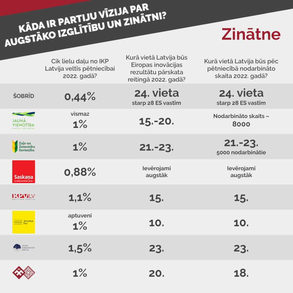 Dalībniekiem tika uzdoti arī jautājumi, uz kuriem bija jāatbild skaitļos. Tie, kā arī vēlāk uzdotie jautājumi, uz kuriem bija jāatbild ar “jā” vai “nē”, tika iesūtīti iepriekš, lai būtu iespēja formulēt politiskās partijas viedokli. Viens no tiem – kurā vietā 2022. gadā būs Latvija pēc pētniecībā nodarbināto skaita pret iedzīvotāju skaitu? Šobrīd Latvija atrodas 24. vietā starp 28 Eiropas Savienības valstīm ar nepilniem diviem pētniecībā nodarbinātajiem uz 1000 iedzīvotājiem. Augstāko rezultātu norādīja “Attīstībai/Par!” pārstāvis, prognozējot 10. vietu. “KPV LV” pārstāvis nosauca 15. vietu, “Jaunās Vienotības” pārstāvis – 15.-20. vietu. Pārējo partiju prognozes – 20. vieta vai zemāk, bet “Saskaņas” pārstāve atbildēja, ka būsim ievērojami augstāk nekā šobrīd. Līdzīgas bija arī atbildes uz jautājumu, kurā vietā Latvija būs Eiropas inovācijas rezultātu pārskata reitingā pēc 4 gadiem. Arī šajā reitingā Latvija ir 24. vietā Eiropas Savienībā, iekļūstot “vidēju inovatoru” kategorijā.