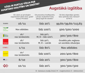 • “Jaunās Vienotības” programmā minēts, ka vienai no universitātēm Latvijā jāiekļūst starp labākajām 100 Eiropas Savienības augstskolām. Partijas pārstāvis minēja, ka, lai universitātes kļūtu konkurētspējīgas, augstākās izglītības finansējums jādubulto uz valsts budžeta pieauguma rēķina. Visdrīzāk, neviena augstskola top 100 neiekļūs, bet jākļūst konkurētspējīgiem Baltijas un Ziemeļeiropas reģionos, ko varēs panākt, piesaistot kvalificētākus mācībspēkus, attīstot kvalitātes vadības sistēmas un veicinot internacionalizāciju.