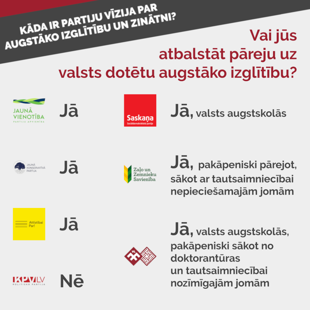 Debašu noslēgumā tika uzdots jautājums par to, vai dalībnieki atbalsta pāreju uz pilnībā valsts dotētu augstāko izglītību. Gandrīz visu politisko spēku pārstāvji pauda atbalstu šai idejai, to ieviešot pakāpeniski vismaz valsts augstskolās. Noliedzoši uz jautājumu atbildēja vienīgi partijas “KPV LV” pārstāvis. Arī par sadarbību ar nozares organizācijām dalībnieki atbildēja apstiprinoši, norādot, ka viņi vēlas to veidot.