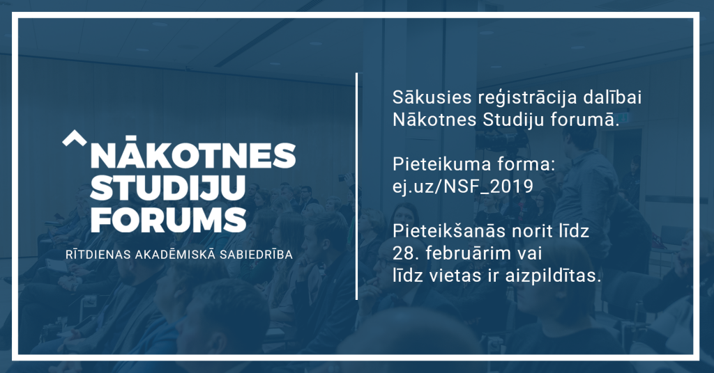 8. martā norisināsies jau trešais Latvijas Studentu apvienības organizētais Nākotnes Studiju forums. Foruma mērķis ir kopā ar augstākās izglītības iestāžu pārstāvjiem un politikas veidotājiem diskutēt par rītdienas akadēmisko sabiedrību un tās izaicinājumiem. Dalībai forumā var pieteikties, aizpildot pieteikuma anketu: ej.uz/NSF_2019.
