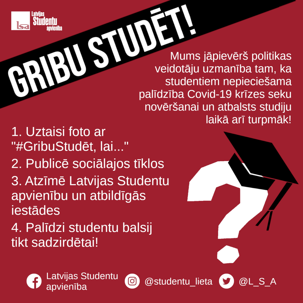 Lai pievērstu politikas veidotāju uzmanību ne vien tam, cik būtiski studējošo finanses ietekmējusi Covid-19 krīze, bet arī ilgstošajām problēmām augstākās izglītības pieejamībā kopumā, LSA rīko tiešsaistes akciju #GribuStudēt, aicinot studējošos un sabiedrību vērst uzmanību uz papildu atbalsta nepieciešamību studentiem gan šobrīd, gan ilgtermiņā.